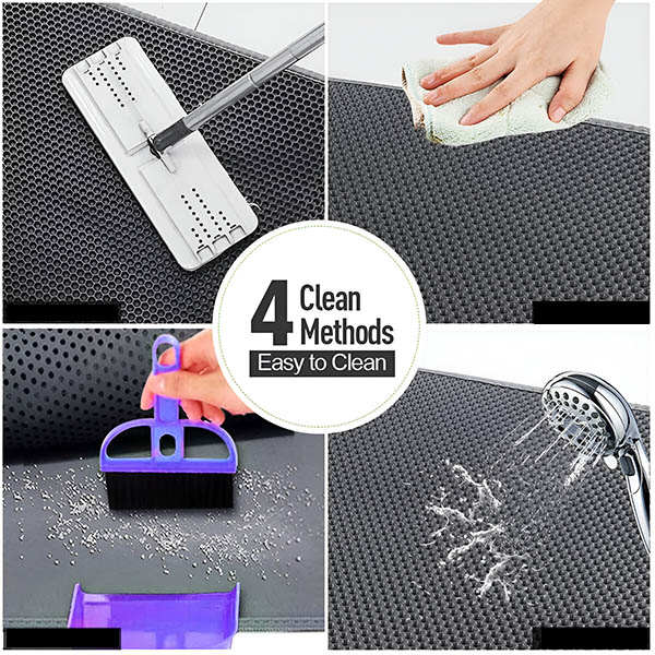 Нема повеќе отпад расфрлан низ домот. Оваа иновативна подлога со дизајн на пчелина мрежа на врвот фаќа песок низ мали дупки. Кога мачката излегува од кутијата, сè песок и нечистотија залепени за шепите се фаќаат и се лизгаат во долниот слој на подлогата. Така може лесно да се врати во кутијата за отпадоци, одржувајќи го подот беспрекорен.