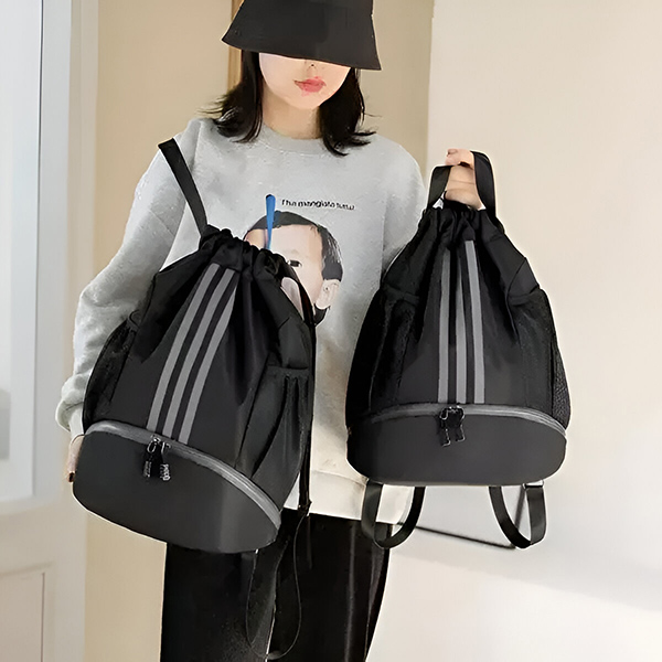 Големиот простор со јажиња е совршен за чување на облека за теретана, чевли, пешкири и шише вода. Има специфично место за сè што ви е потребно за ефикасна тренинг сесија. Нема повеќе да пребарувате низ вашата торба: сè има свое место.